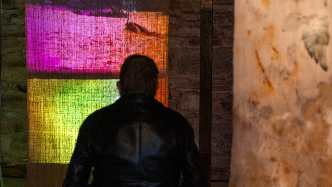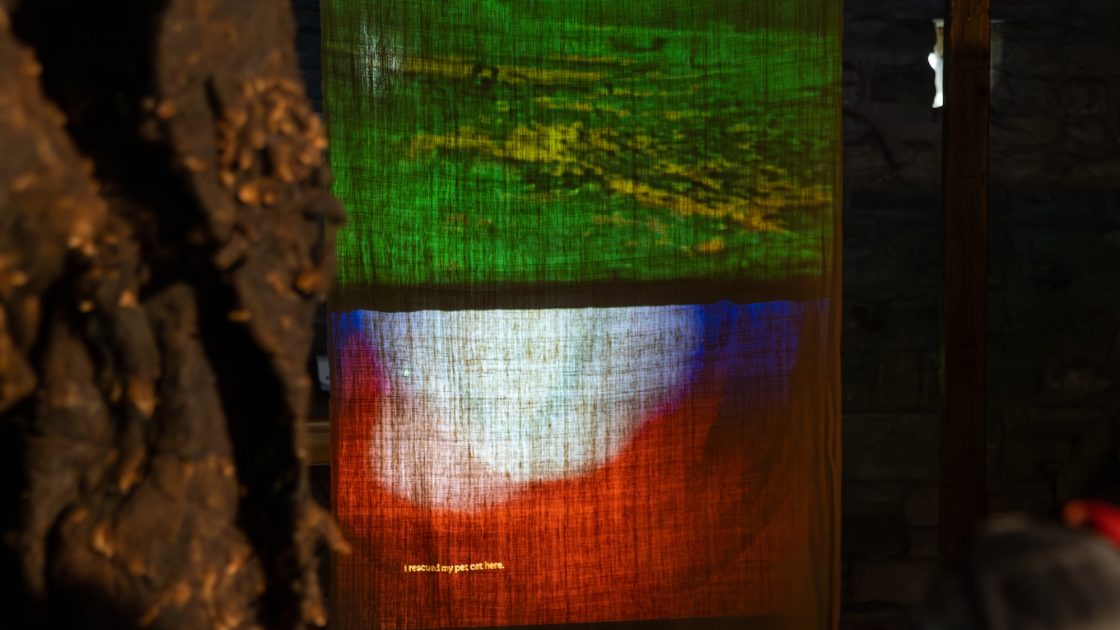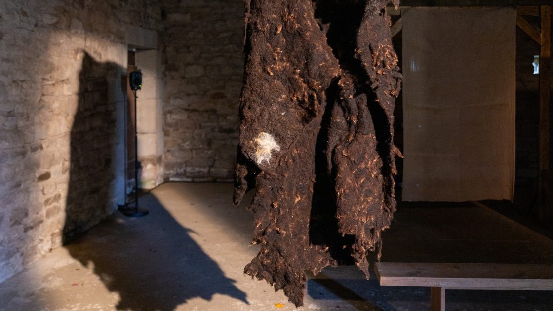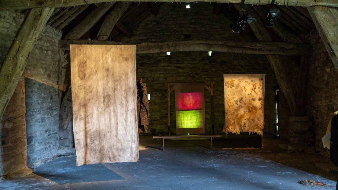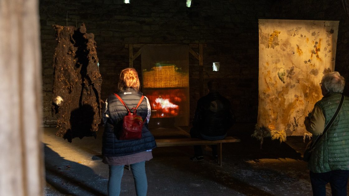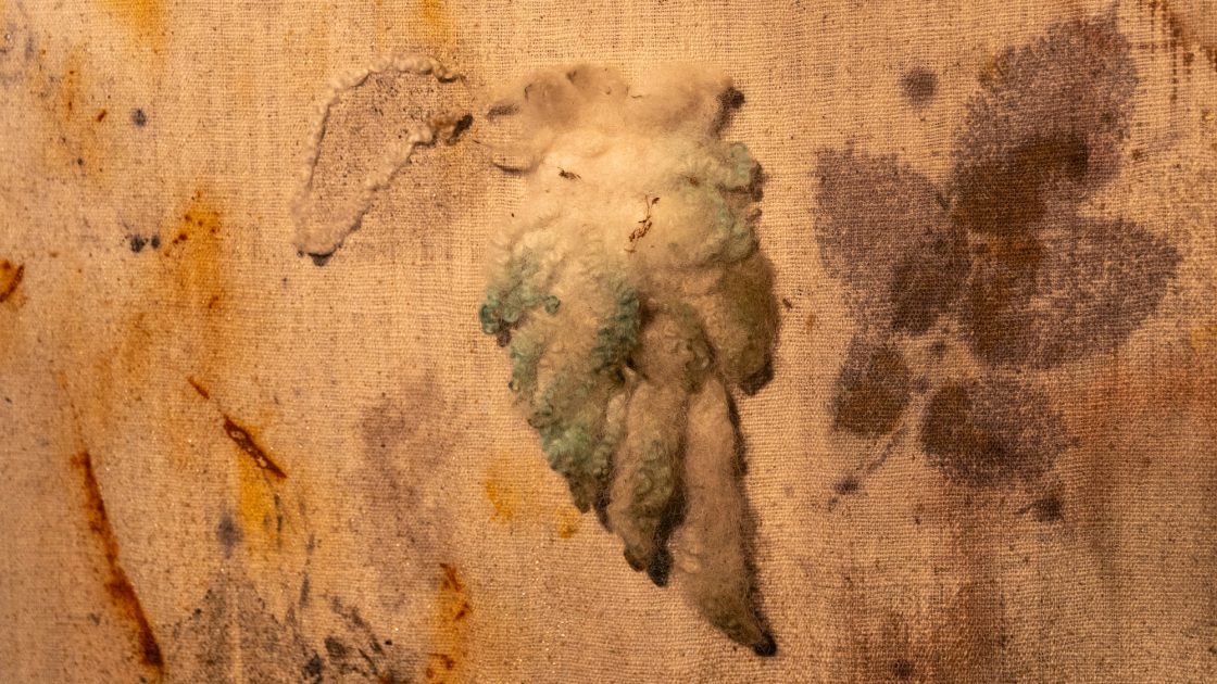 Are You Lost? Is a multimedia installation from artists Kate O’Farrell and Rob St John. Over the last year, Rob worked with people in and around the Forest of Bowland, exploring themes of environmental justice, land access and personal connections to the landscape. The film, soundscapes and textiles have been created through these conversations. O’Farrell’s textiles have been worked into using traditional craft techniques with materials gathered from the landscape, including one piece made from sheared sheep wool gathered from Bowland farms, whilst two are worked on hand-woven cotton khadi made by weavers in Gujarat.