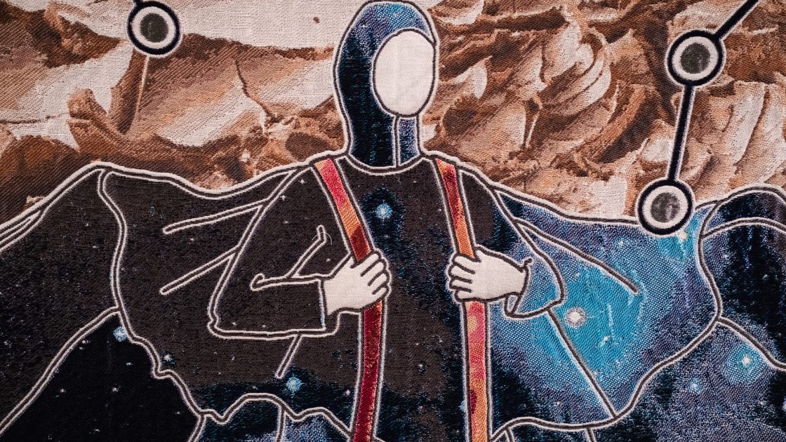 Using traditional vernacular and state-of-the art digital weaving, this dwelling sculpture imagined by Lucy Orta, is constructed from nine immense patterned tapestry panels woven at the TextielLab, Tilburg. The tapestries tell the story of a world drastically altered by climate change, merging histories of past-present-future, passing through dense jungles and desert landscapes where scarcity of resources results in conflict, yet from whose ruins emerge alternative forms of life, with new ways of living and being.